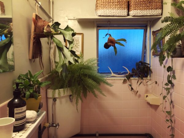 3か月程前に購入した苔玉のビカクシダがここバスルームで順調に育ってるので、適した環境だと判断しました。もっと生長してジャングル感をアップさせたい。