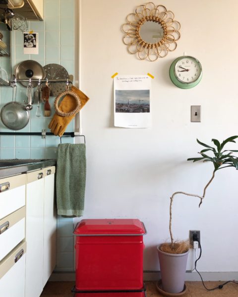 ラタンのミラーや、インテリアスタイリスト作原文子さんが主催するブランド、『MOUNTAIN MORNING』のポスターをあえてラフに貼ったりと、抜け感を意識したスタイリングに。