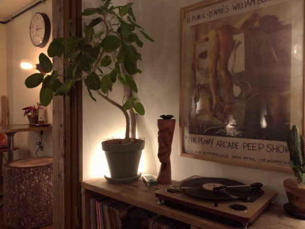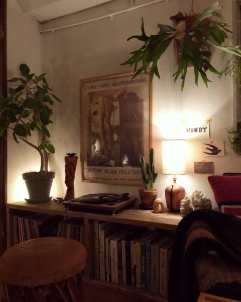 ソファに向かって左側の、自作のローシェルフの上。