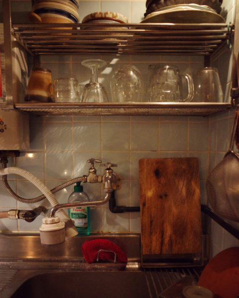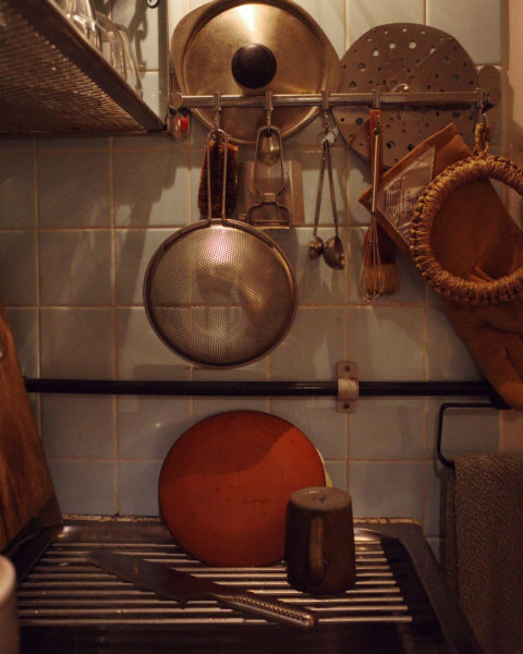 これまたすぐ上にクリップランプがあるんで、柳宗理さんの鍋のフタやパンチングストレーナーが、その光を鈍く反射してくれてます。